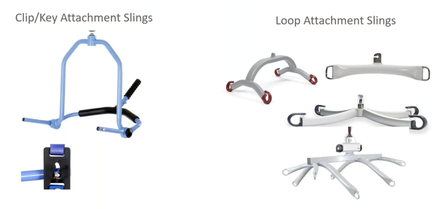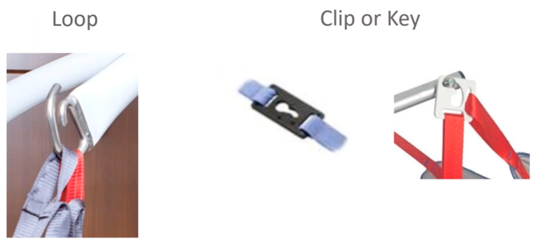 Hanger bar attachments can also differ between slings. Patient slings feature one of two attachment types: a loop attachment that slides onto and hangs from a piece of metal or a clip or key attachment that connects the sling to the hanger bar.